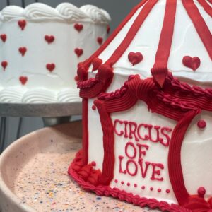 Diese außergewöhnliche Valentinstags-Torte bringt große Gefühle und ein kleines bisschen Magie auf den Tisch. Im romantischen Zirkuszelt-Design mit rot-weißen Streifen, liebevollen Herzdetails und goldener Kugel als Krönung wird sie garantiert zum Hingucker eurer Liebesvorstellung. Umhüllt ist die Torte von unserer cremigen Vanille-Buttercreme, verfeinert mit einer kleinen geheimen Zutat, die sie besonders zart und unwiderstehlich macht. Die Füllung könnt ihr ganz nach Wunsch wählen, für einen Geschmack, der genau so individuell ist wie eure Liebe. Perfekt für alle, die am Valentinstag nicht nur Blumen, sondern ein echtes Highlight verschenken möchten.